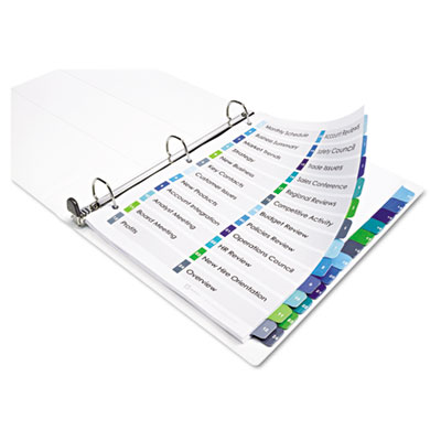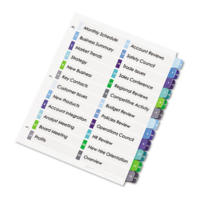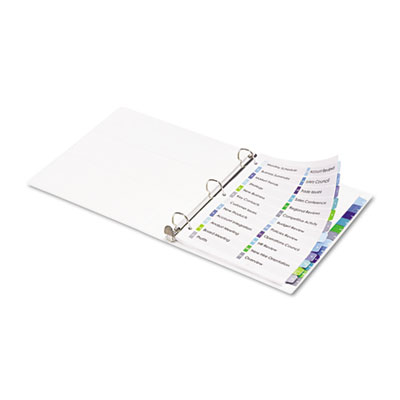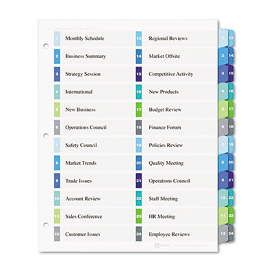 Table of contents has two-column format—include more information in your presentations. Bottom-layer tabs have less overlap and extend further than top tabs so you can view all tabs at once. Extended tab reinforcement prevents tearing. Heavyweight paper stock for added durability. Three-hole punched for use in standard ring binders. Tab Style: 24-Tab; Tab Color(s): Multicolor; Index Divider Size: 11 x 8 1/2.