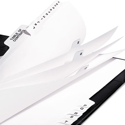 Rip Proof™ reinforced, dual-sided, laminated tabs make it easy to organize your information. The binding edge is unpunched, so these dividers can fit practically any binding system. Your motion for clean and orderly files has been granted. Ideal for index briefs, legal exhibits, mortgage documentation files and more! Tab Style: 26-Tab; Tab Color(s): White; Index Divider Size: 11 x 8 1/2.