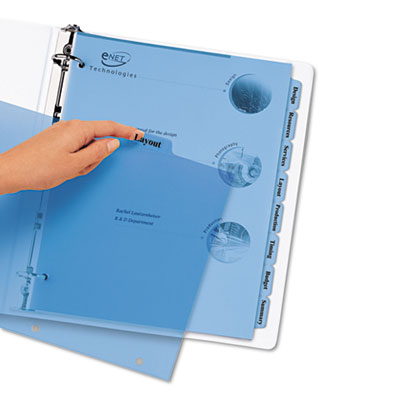 Clear labels virtually disappear beneath text, so letters and numbers really stand out. Reinforced tabs stay strong with every page turn. Plastic dividers ensure extra durability so you can use them over and over again. Laser and inkjet printer compatible. Tab Style: 8-Tab; Tab Color(s): Blue; Index Divider Size: 11 x 8 1/2.