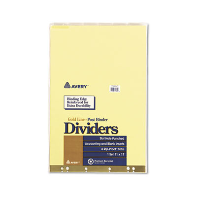 Rip Proof™ tabs for long life. Printed accounting titles and blank inserts included for customizing to your specific needs. Gold reinforcing at binding edge so index won't tear out of binder. Tab Style: 6-Tab; Tab Color(s): Clear; Index Divider Size: 11 x 17.