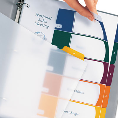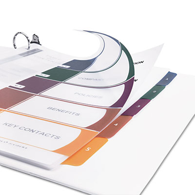Table of Contents page is translucent, allowing a section title sheet printed on your laser or inkjet printer to show through. Numbered tabs color-coded to section numbers on Table of Contents page. Perfect for referencing professional reports. Tab Style: 5-Tab; Tab Color(s): Multicolor; Index Divider Size: 11 x 8 1/2.