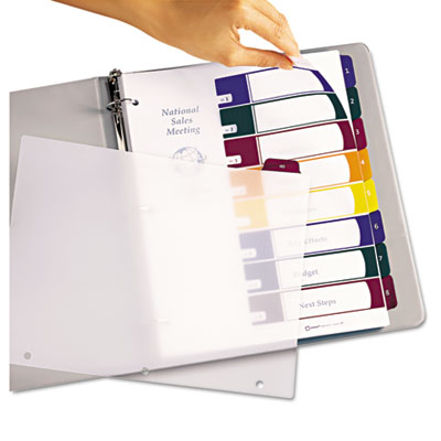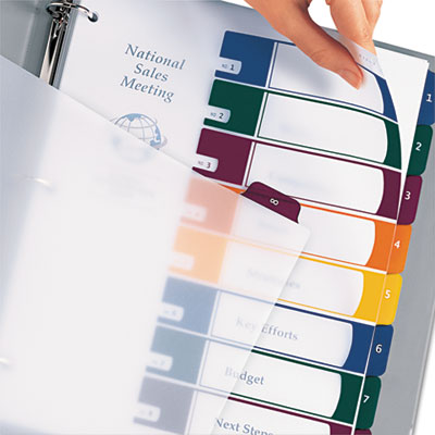 Table of Contents page is translucent, allowing a section title sheet printed on your laser or inkjet printer to show through. Numbered tabs color-coded to section numbers on Table of Contents page. Perfect for referencing professional reports. Tab Style: 8-Tab; Tab Color(s): Multicolor; Index Divider Size: 11 x 8 1/2.