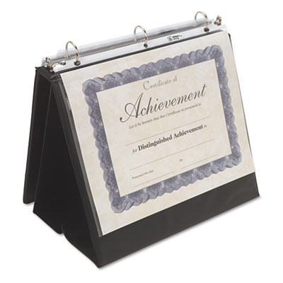 Ideal for proposals and manuals. Cover folds back to form a landscape format easel for presentations. Includes eight three-hole punched, clear sheet protectors. Holds unpunched sheets up to 11 x 8-1/2. 1" capacity. Capacity Range [Max]: 1"; Sheet Capacity: 175; Color(s): Black.