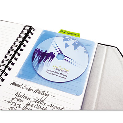 Stick these convenient adhesive-backed storage pockets in a notebook, date planner or folder. Easy to remove and reposition—won't damage surfaces. Secure closure keeps your discs safely inside. Attached tabs can be written on, so you can see the contents at a glance. Media Stored: CD;DVD; Capacity (text): 1; Material(s): Polypropylene.