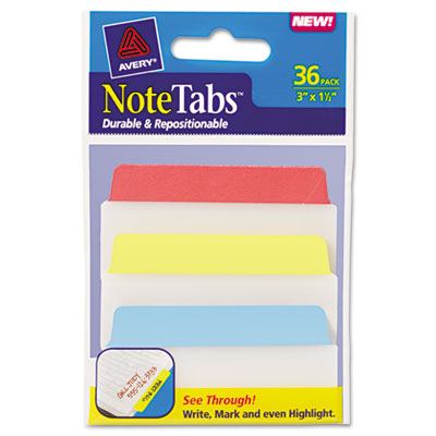 AVE16376 NoteTabs-Notes, Tabs and Flags in One, Blue/Green/Red/Yellow, Three Inch, 36/PK By AVERY-DENNISON
