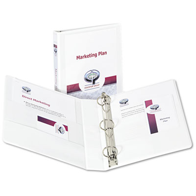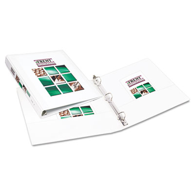 Unique EZ-Turn™ ring design for smoother page turning. Crystal clear overlay enhances custom inserts on front cover, back cover and spine. Back-mounted rings allow pages to lie flat. Wider front and back binder panels fully cover standard dividers and sheet protectors. Two opaque interior pockets for improved organization. Capacity Range [Max]: 1"; Sheet Capacity: 220; Color(s): White.