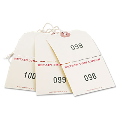 Large enough for stamping. "RETAIN THIS CHECK" printed in red on tear-off stub. Made of sturdy Manila cardstock. Reinforced eyelet won't tear easily. Strung with white twine for easy hanging. Size: 4 3/4 x 2 3/8; Color(s): Manila; Series: 1 to 500.