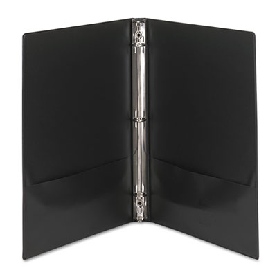 Customize the front cover, back cover and spine crystal-clear overlays to meet your individual needs. No "bunching", pages lie flat against back cover. Two inside pockets for additional storage of loose documents. Rings mounted on back cover. Capacity Range [Max]: 1/2"; Sheet Capacity: 100; Color(s): Black.
