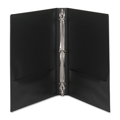 Customize the front cover, back cover and spine crystal-clear overlays to meet your individual needs. No "bunching", pages lie flat against back cover. Two inside pockets for additional storage of loose documents. Rings mounted on back cover. Capacity Range [Max]: 1"; Sheet Capacity: 175; Color(s): Black.
