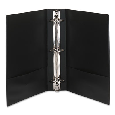 Customize the front cover, back cover and spine crystal-clear overlays to meet your individual needs. No "bunching", pages lie flat against back cover. Two inside pockets for additional storage of loose documents. Rings mounted on back cover. Capacity Range [Max]: 2"; Sheet Capacity: 375; Color(s): Black.