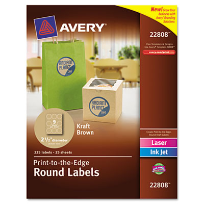 Ideal for creating branding or promotional labels. Glossy labels provide vivid colors and sharp text. Kraft brown paper is recyclable and made with 100% recycled material. Colors can extend right to the edge of the label. Patented Easy Peel® feature for fast peeling—simply bend the label sheet to expose the Pop-up Edge®, making it quick and easy! Avery offers free, easy-to-use templates. Laser and inkjet compatible. Glossy finish. Laser and inkjet compatible. Label Size - text: 2 1/2" dia.; Label Color(s): Brown Kraft.