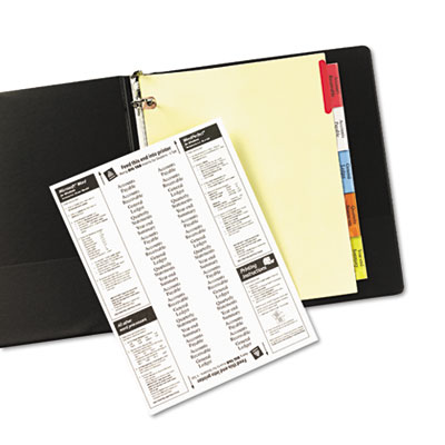 50% more printing space for tab titles than traditional tab dividers. Special tab design allows easy insertion and removal, but keeps insert securely in place. Three-hole punched for use in standard ring binders. Laser and inkjet printer compatible. Tab Style: 5-Tab; Tab Color(s): Multicolor; Index Divider Size: 11 x 8 1/2.