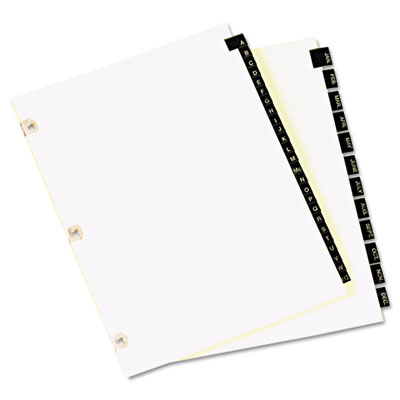 Gold color printing on front and back of tabs. Copper reinforced holes for added strength. Three-hole punched for use in standard binders. Tab Style: 25-Tab; Tab Color(s): Black; Index Divider Size: 11 x 8 1/2.