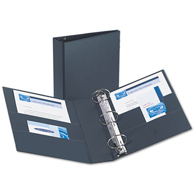 Unique EZ-Turn™ ring design for smoother page turning. Back-mounted rings allow pages to lie flat. Two inside pockets store unbound materials so nothing gets lost. Black vinyl interior liner masks minor blemishes, wear and soil. Capacity Range [Max]: 3"; Sheet Capacity: 600; Color(s): Black.