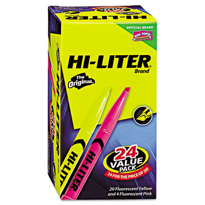 Bright fluorescent colors. Durable plastic chisel tip for smooth highlighting. Slim size with sturdy clip to fit in your pocket, organizer or binder. 24 for the price of 20. 20 fluorescent yellow, four pink. Color(s): Fluorescent Yellow; Tip Type: Chisel.