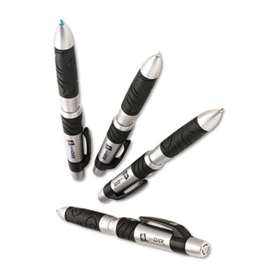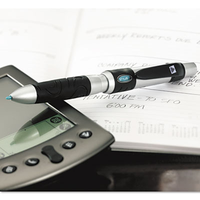 Multifunction writing instrument features stylus, ballpoint pen, and mechanical pencil for all your writing needs. Ideal for electronic organizer touch screens as well as old-fashioned paper. Viewing window allows you to navigate easily when selecting the desired function. Ergonomic design and soft rubber grip reduces writing fatigue. Pen Style: Retractable; Ink Color(s): Black.
