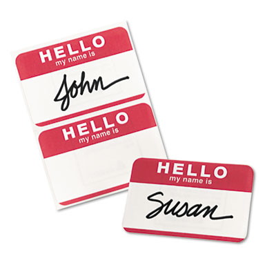 Badges adhere firmly and remove easily. Ideal for identifying individuals at offices, schools and special events. Designed for most fabrics except vinyl, leather, suede, silk, velvet, corduroy or plastic. Label Size - text: 2 11/32 x 3 3/8; Label Color(s): White; Border Color(s): Red.