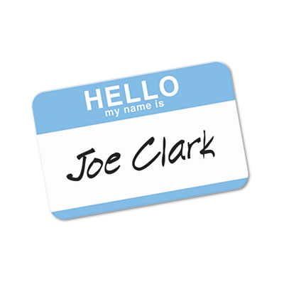 Badges adhere firmly and remove easily. Ideal for identifying individuals at offices, schools and special events. Designed for most fabrics except vinyl, leather, suede, silk, velvet, corduroy or plastic. Label Size - text: 2 11/32 x 3 3/8; Label Color(s): White; Border Color(s): Blue.