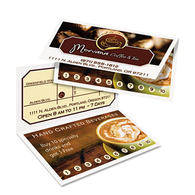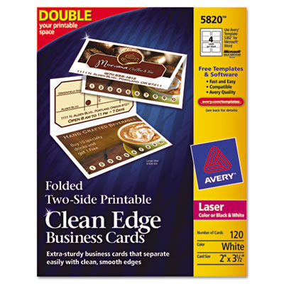Folded business cards give you double the printable space. Perfect for maps, directions, product or price lists, appointment reminders and more. High-quality, heavyweight card stock. Clean Edge technology ensures cards snap apart with smooth, non-perforated edge. Easy to use with free Avery templates and software. Each card: 3 1/2 x 2. Paper Color(s): White; Finish: Matte.