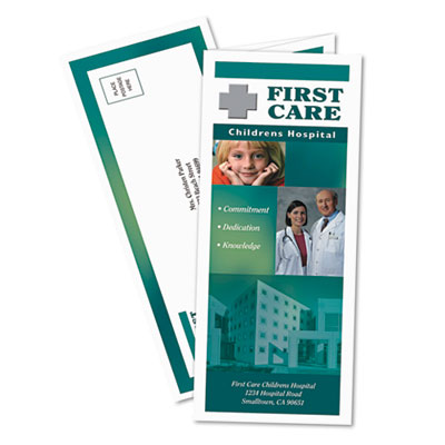 Create colorful communications with your printer. Great for business announcements and newsletters. Scored for easy folding. Heavyweight, high-quality paper coated on both sides allows for two-sided printing with sharp text and brilliant colors. Includes clear printable mailing seals. Glossy finish. Size: 8 1/2 x 11; Paper Color(s): White.