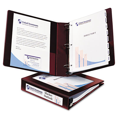 Clean, elegant border on front panel perfectly frames and centers title page for a professional look. Easily insert title page and spine ID with convenient mounting sheets. Gap Free™ feature prevents ring misalignment so pages turn smoothly. Back-mounted rings allow pages to lie flat. Wider front and back binder panels now fully cover standard dividers and sheet protectors. Business card slot for adding your business card to proposals and presentations. Two clear inside pockets allow for additional storage of loose documents. Capacity Range [Max]: 2"; Sheet Capacity: 500; Color(s): Maroon.