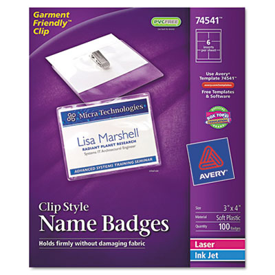 Durable soft, PVC-free plastic is reusable and displays names clearly. Top-loading design. Micro-perforated inserts separate cleanly leaving smooth edges. Create simple, fast, professional name badges with free AveryŽ templates and software. Kit includes clear plastic badge holders and micro-perforated 8 1/2 x 11 sheets of inserts. Improved clip design holds badge firmly in place. Name Badge Label Length: 4"; Name Badge Label Width: 3"; Name Badge Label Color(s): White.
