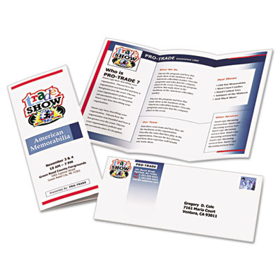 Create colorful communications with your printer. Great for business announcements and newsletters. Scored for easy folding. Heavyweight, high-quality paper coated on both sides allows for two-sided printing with sharp text and brilliant colors. Includes clear printable mailing seals. Matte finish. Size: 8 1/2 x 11; Paper Color(s): White.