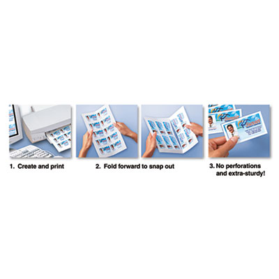 Folded business cards give you double the printable space. Perfect for maps, directions, product or price lists, appointment reminders and more. High-quality, heavyweight card stock. Clean Edge technology ensures cards snap apart with smooth, non-perforated edge. Easy to use with free Avery templates and software. Each card: 3 1/2 x 2. Paper Color(s): White; Finish: Matte.