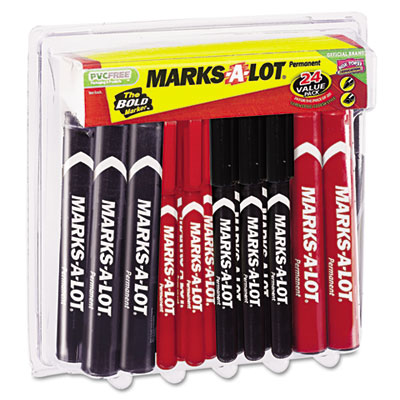 Experience enduring satisfaction with this larger-than-usual marker. Marks virtually any surface, including metal and plastic, and resists water and rubbing to minimize smearing. Durable 3/16" chisel tip lets you write with a variety of line widths, from bold, high-visibility strokes to smaller lines. Low odor. 24 for the price of 20. 16 black and 8 red (12 Desk Style & 12 Pen Style). Marker Type: Permanent; Assortment: 16 Black; Color(s): Black;Red.