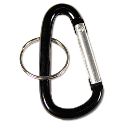 Classic D-shaped carabiner key chains made of solid aluminum. Strong spring hinge opens smoothly for attaching carabiner to bags, backpacks, belt loops, etc. Split key ring is ideal for keys, badge holders, etc. Material(s): Aluminum; Color(s): Black.