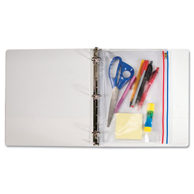 Keep writing instruments, paper clips, and various loose items neatly contained and close by. Heavy, clear matte vinyl body. Plastic snag-proof red and blue striped zipper with gold slider. Hole-punches allow use in various size binders. Heat sealed edges ensure contents remain secure. Color(s): Clear; Height: 11 in; Width: 8 1/2 in.
