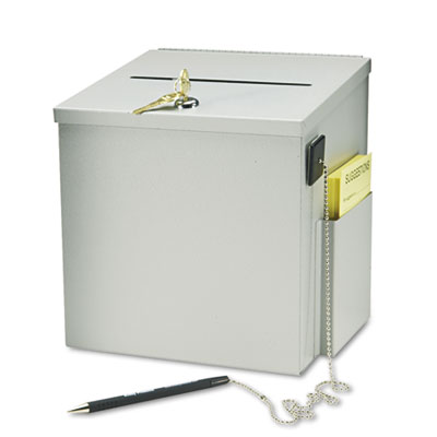 Units lock for added confidentiality. Side pocket holds blank suggestion cards close. Pen attaches anywhere on the box. Can be wall mounted (hardware not included). Find out what people really think! Color(s): Platinum; Width: 8 1/2"; Height: 9 3/4".