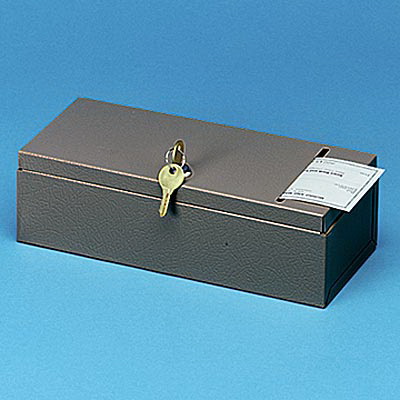 Product Description: Steel Security Check File Box 4" slotted top; insert checks while box remains locked. Wafer tumbler lock. 30% recycled steel. 10-3/16w x 4-1/2d x 3-1/8h. Gray