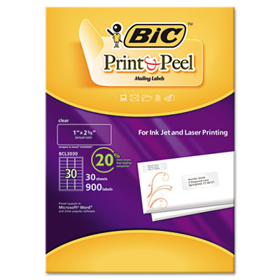 BICBCL3030CLR Easy Print & Peel Clear Mailing Labels 1 x 2-5/8, Clear, 900/Box By BIC CORP.
