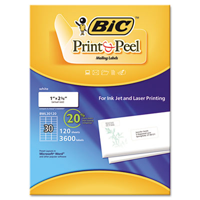 BICBWL30120WHI Easy Print & Peel White Mailing Labels, 1 x 2-5/8, White, 3600/Pack By BIC CORP.