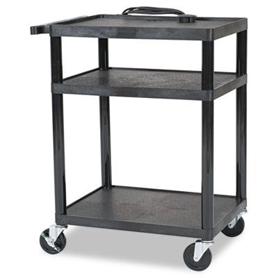 Snap-on panels (included) let you convert this versatile AV cart into a utility or food service cart quickly and easily. Change cart height and number of shelves as you desire. Durable injection molded plastic construction is rust-, dent-, scratch- and stain-resistant. Textured surface shelves keep contents from sliding off. Moves across any flooring on 4-inch casters (two locking). Includes UL/cUL Approved, three-outlet power strip with 20 ft. cord. Color: Black; Capacity (Weight): 300 lbs.; Caster/Glide/Wheel: Four 4" Swivel Rubber Casters (2 Locking).