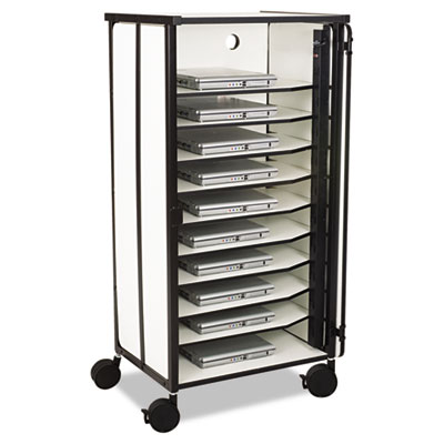 Keep up to 10 laptops secure and fully charged. Built-in UL/CSA-approved electrical outlet for each compartment. Locking door folds back and stays open with a magnet while loading or unloading laptops. Four heavy-duty swivel casters (two locking) for easy maneuverability. Color: White; Caster/Glide/Wheel: Four 4" Swivel Casters (2 Locking).