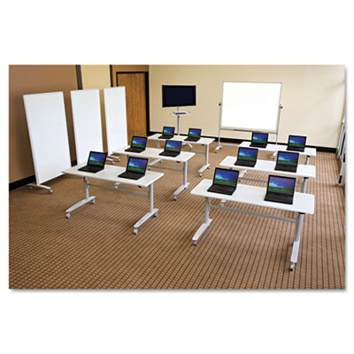 The 1" thick tops flip back with a simple lever mechanism, allowing the tables to be nested for storage. Top and Base sold and shipped separately—ORDER BOTH. Top Color: Platinum; Top Shape: Rectangular.
