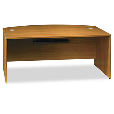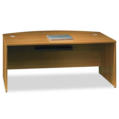 Total flexibility to create administrative, professional or executive office solutions. Modular component for flexibility to create administrative, professional or executive solutions. All-melamine construction with durable Diamond Coat® worksurfaces provides superior scratch- and stain-resistance. Protective PVC edging helps reduce damage from dents and dings. Worksurface grommet for easy cord management. Color: Modern Cherry; Top Shape: Bow Front.