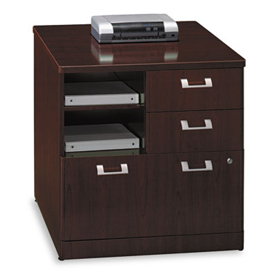 Durable Diamond Coat® worksurfaces provides superior scratch- and stain-resistance. Drawers accommodate letter- or legal-sized files. Full-extension ball bearing slides on drawers for smooth and quiet operation. Open compartment with removable shelf enables ample storage space. Color: Harvest Cherry; Overall Width: 29 1/4"; Overall Depth: 23 1/4".