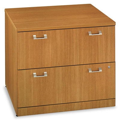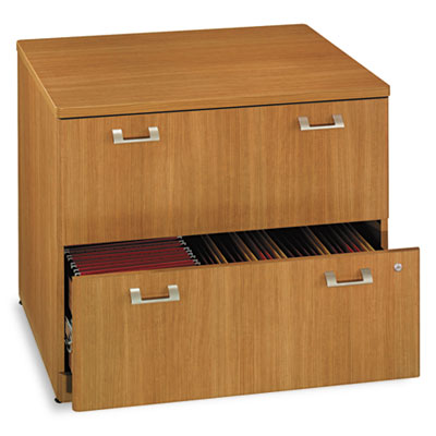 All-melamine construction with Diamond Coat® provides superior scratch and stain resistance. Lockable drawers hold letter- or legal-size files. Full-extension ball bearing drawer slides. Color: Modern Cherry; Overall Width: 35 3/4"; Overall Depth: 23 1/2".