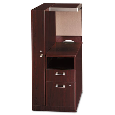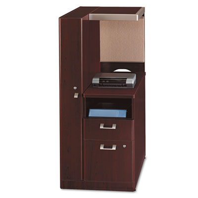Locking storage and legal- or letter-size file drawers, plus an open box drawer. Vertical locker for garments and personal items has separate lock. Fabric covered tackboard, with cutout for wire management, that accepts Bush® Paper Tray or Bush® Metal Marker Board, both sold separately. Storage Tower consists of two pieces. You must ORDER BOTH CARTONS. Color: Harvest Cherry; Overall Width: 23 1/8"; Overall Depth: 23 1/2".