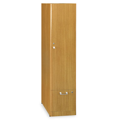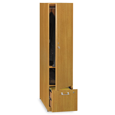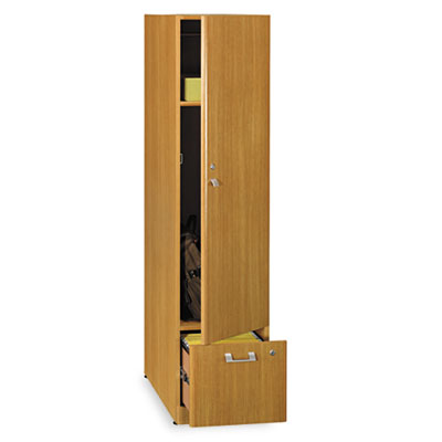 Total flexibility to create administrative, professional or executive office solutions. Locker portion includes a coat rod, fixed shelf and an adjustable shelf behind single, lockable door. Bottom has locking file drawer that holds letter- or legal-sized files. Door mounts on either side of the locker. Color: Modern Cherry; Overall Width: 15 3/4"; Overall Depth: 23 1/8".