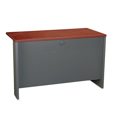 Durable worksurface is scratch- and stain-resistant. Protective PVC edge banding. Not freestanding. Use on right or left side of Bow Front Desk or Rectangular Desk to create an "L" workstation; add a Credenza for a "U" grouping. Color: Hansen Cherry; Graphite Gray.