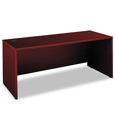 Durable melamine worksurface is scratch- and stain-resistant. Banded design on edges protects desk from bumps and collisions. Desktop and modesty panel grommets allow wire access and concealment. Modular unit permits numerous configurations. Use alone or combine with Return Bridge and Credenza to form a "U" grouping. Color: Mahogany; Top Shape: Rectangular.