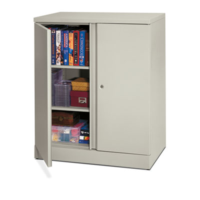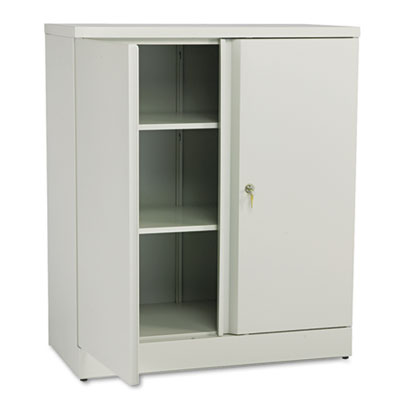 Tough construction provides extreme durability. Magnetic clip keeps unlocked doors shut. Reinforced base ensures stability. Shelves adjust in 13/16" increments to accommodate different sized materials. Leveling glides adjust for uneven floors. Two adjustable shelves. Color: Light Gray; Overall Width: 36"; Overall Depth: 18".