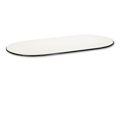 High-pressure laminate top. Patented Superstrut™ steel stretcher reinforcement for a no-sag surface. Durable black bullnose edge protects table from damage. Finish on surface helps reduce scrapes and scratches. Top and Base sold and shipped separately—ORDER BOTH. Top Color: Light Gray; Top Shape: Oval.