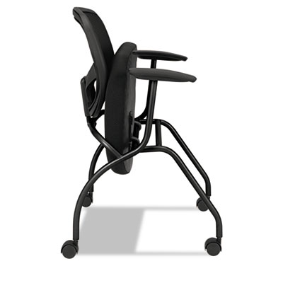 Contemporary design with a contoured mesh back and upholstered flip-up seat. Folds to 7-1/2" for space-efficient nested storage. Comfortable arm supports and easy-rolling casters for mobility. Recommended Applications: Guest, Reception, Waiting Room & Lounge; Seat/Back Color: Black.