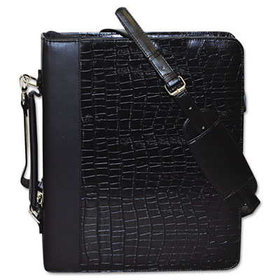 Unzip this portfolio and get down to business, it keeps all your supplies at your fingertips. Built-in calculator, card and pen holders, letter-size writing pad and a 3-ring binder for documents. All in a stylish croco design with rich leather accents and removable shoulder strap. Material(s): Polyurethane/Leather Trim; Carrying Method: Shoulder Strap.