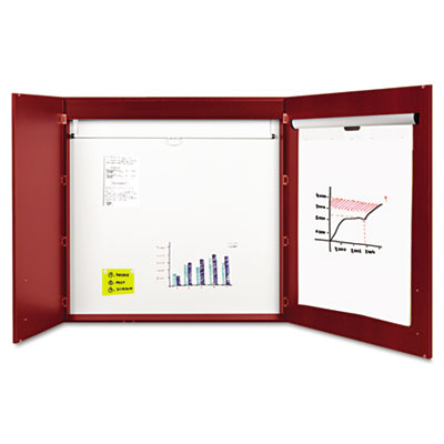 Style and sophistication meet form and function. Conference cabinet offers durable wood construction with a lustrous finish. Double doors feature heavy-duty hinges and brushed nickel door pulls. Inner doors offer an easel pad holder. Pure white magnetic dry erase surface is perfect for notes and brainstorming. Pure white magnetic dry-erase surface is ideal for notes and brainstorming. Easy mounting hardware included. Board Width: 48"; Board Height: 48".
